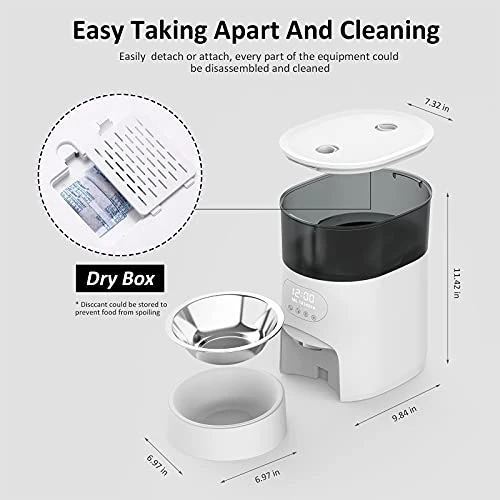 - Double Button Lock – Top double button lock cover can prevent pets from changing settings using their paws and opening the top cover to overthrow the food. Also can to keep dry food crunchy, flavorful and secure. Food tank and tray are removable for cleaning.